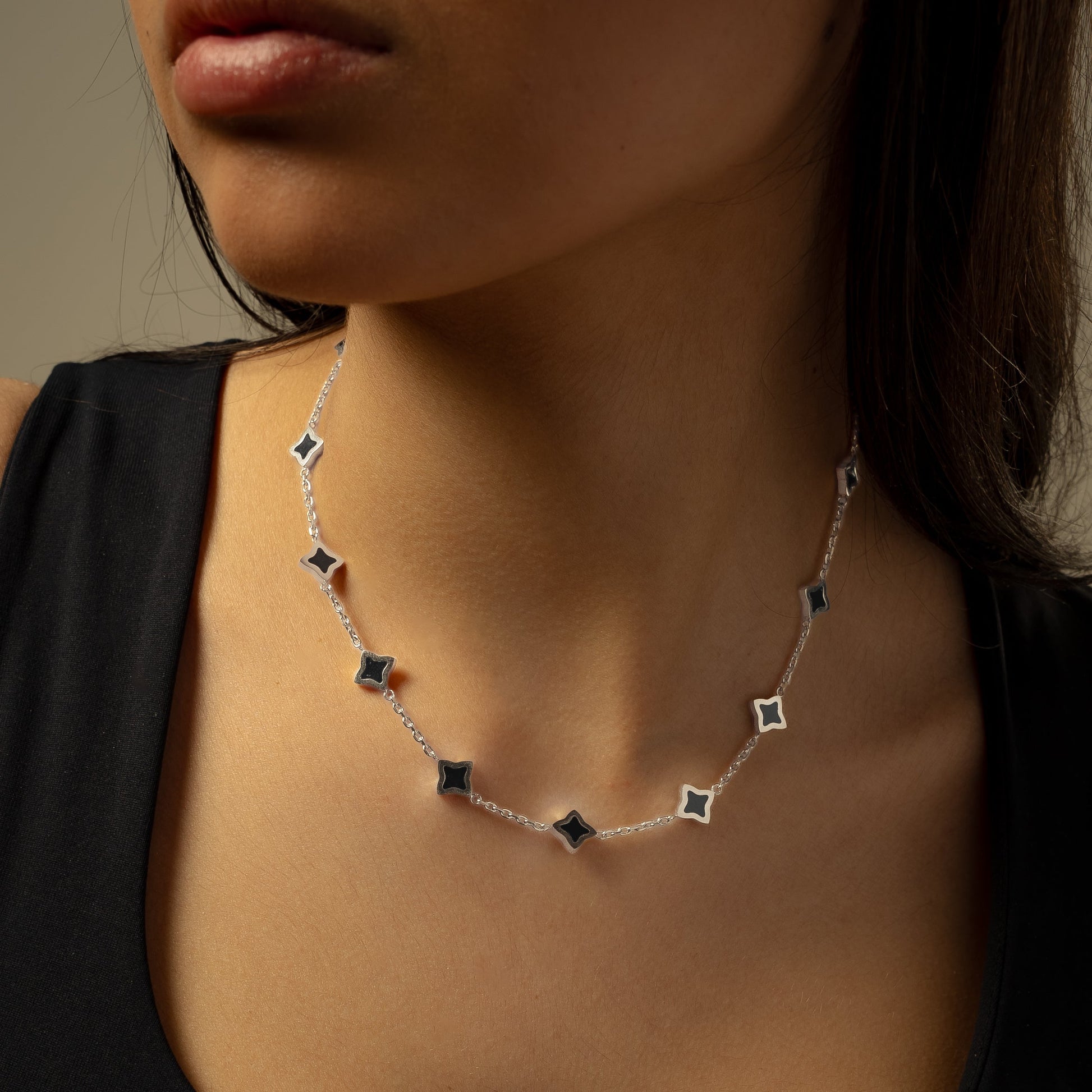 Discover our Flower Chain, an exquisite piece that combines the timeless elegance of a cable chain with the delicate beauty of flowers. Each flower, adorned with an imitation onyx stone and 8 mm thick, adds a touch of charm and sophistication to this 2 mm chain.