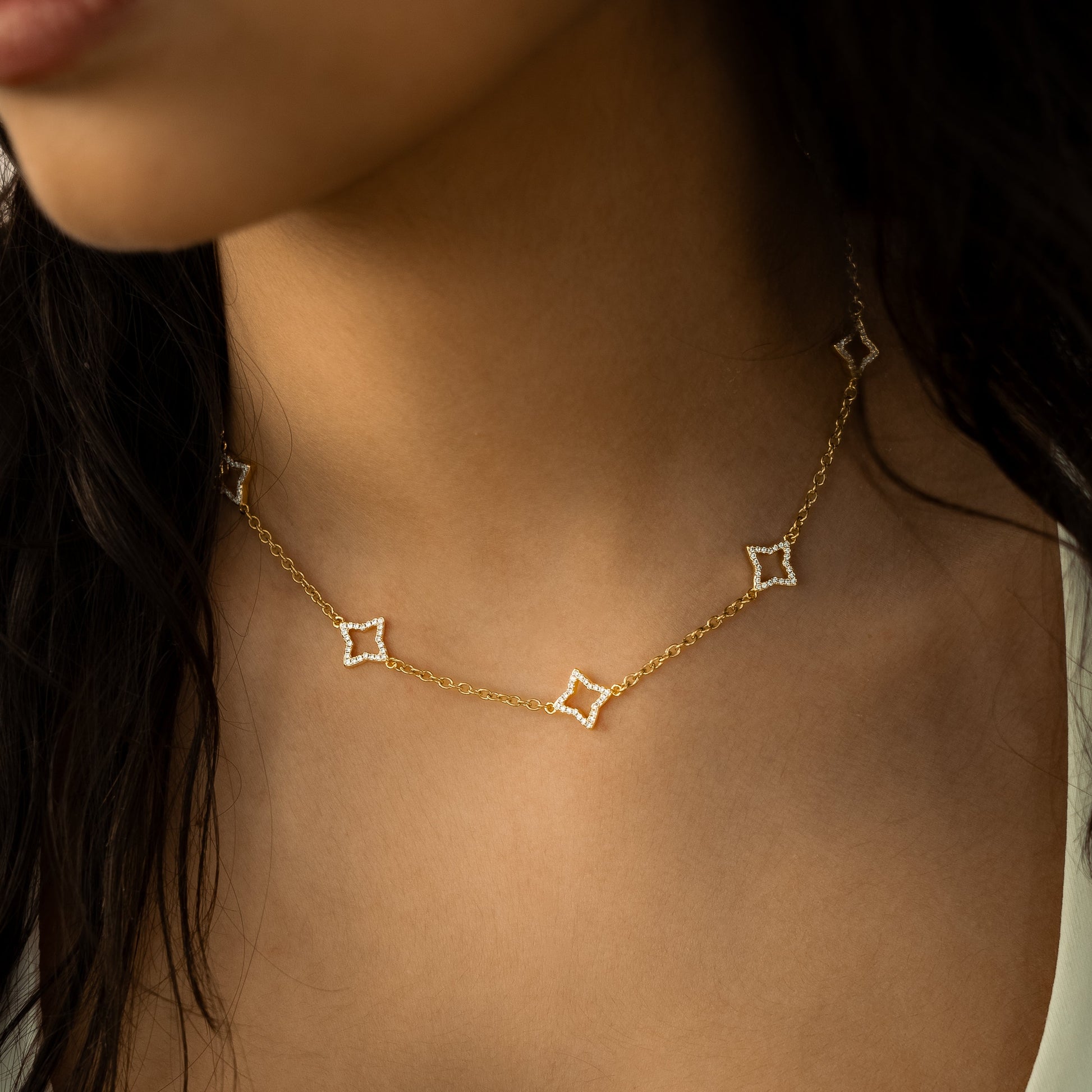 Discover our Hollow Flower Chain, a piece that captures the essence of sophistication. Each flower on this 3mm cable chain is beautifully embellished with sparkling stones, offering a subtle and refined sparkle.