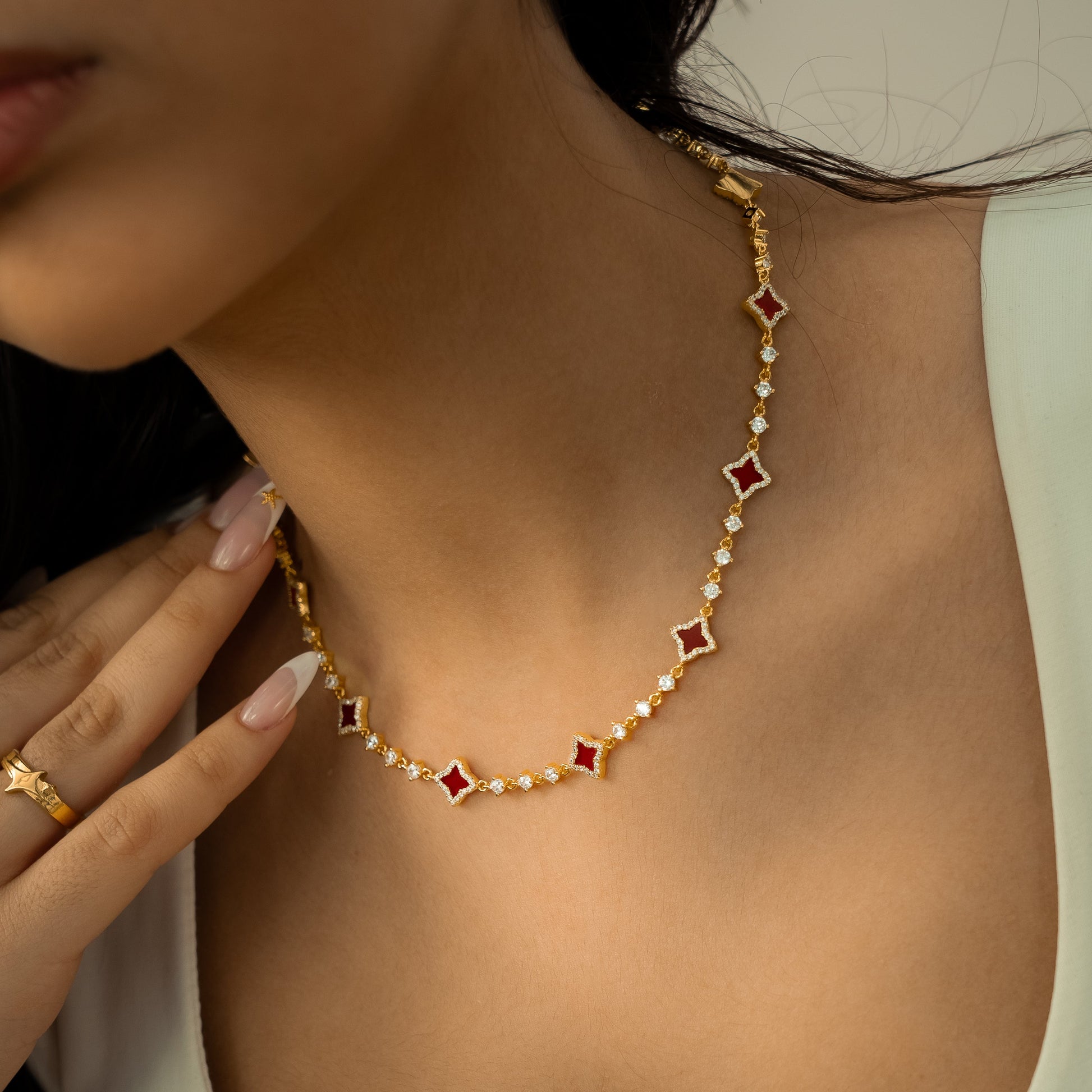 Discover our Flower Tennis Chain, an exquisite piece that combines the timeless elegance of a tennis chain with the delicate beauty of flowers. Each flower, adorned with a carnelian-look stone and 8 mm thick, adds a touch of charm and sophistication to this 3 mm chain.