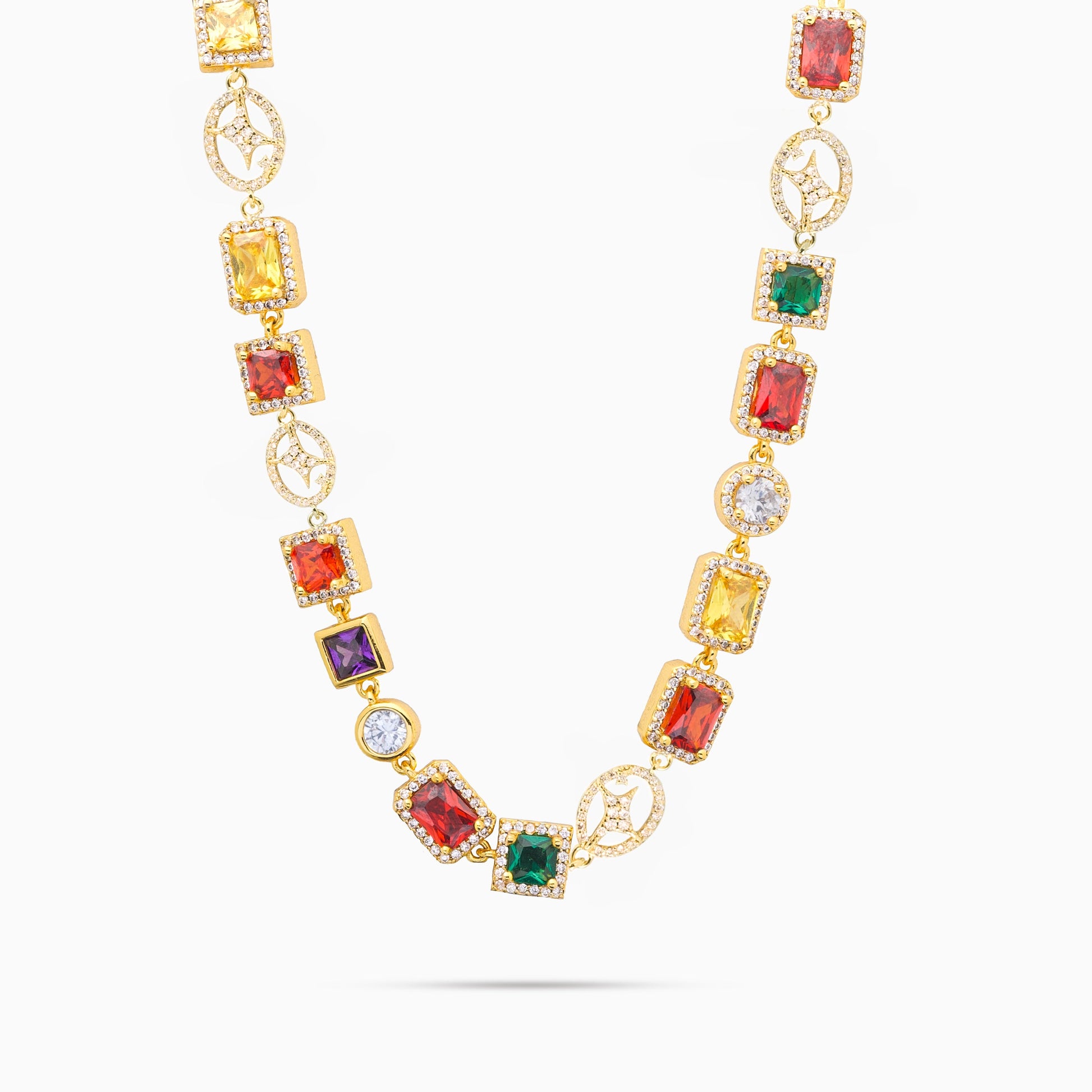 Discover our Multi Gemstone Chain, an exquisite piece that captivates with its beauty and brilliance. Each stone, in a variety of shapes and colors (white, yellow, red, green, and purple), is carefully selected to create a mesmerizing visual harmony. With 8mm thick gemstones, this chain offers a truly vibrant array of colors.