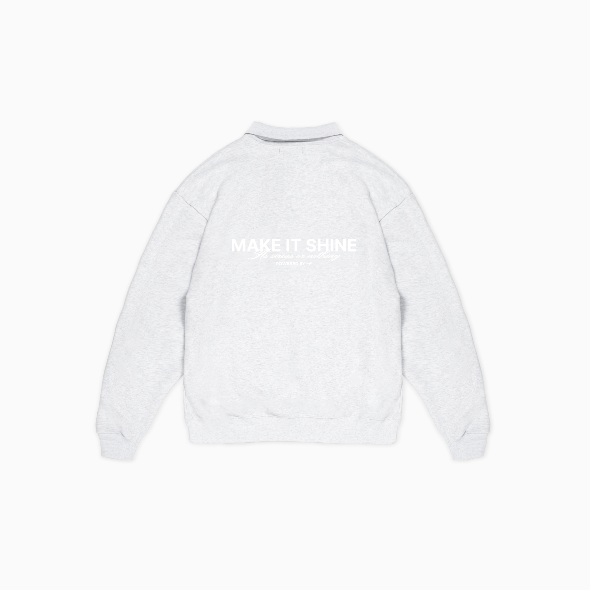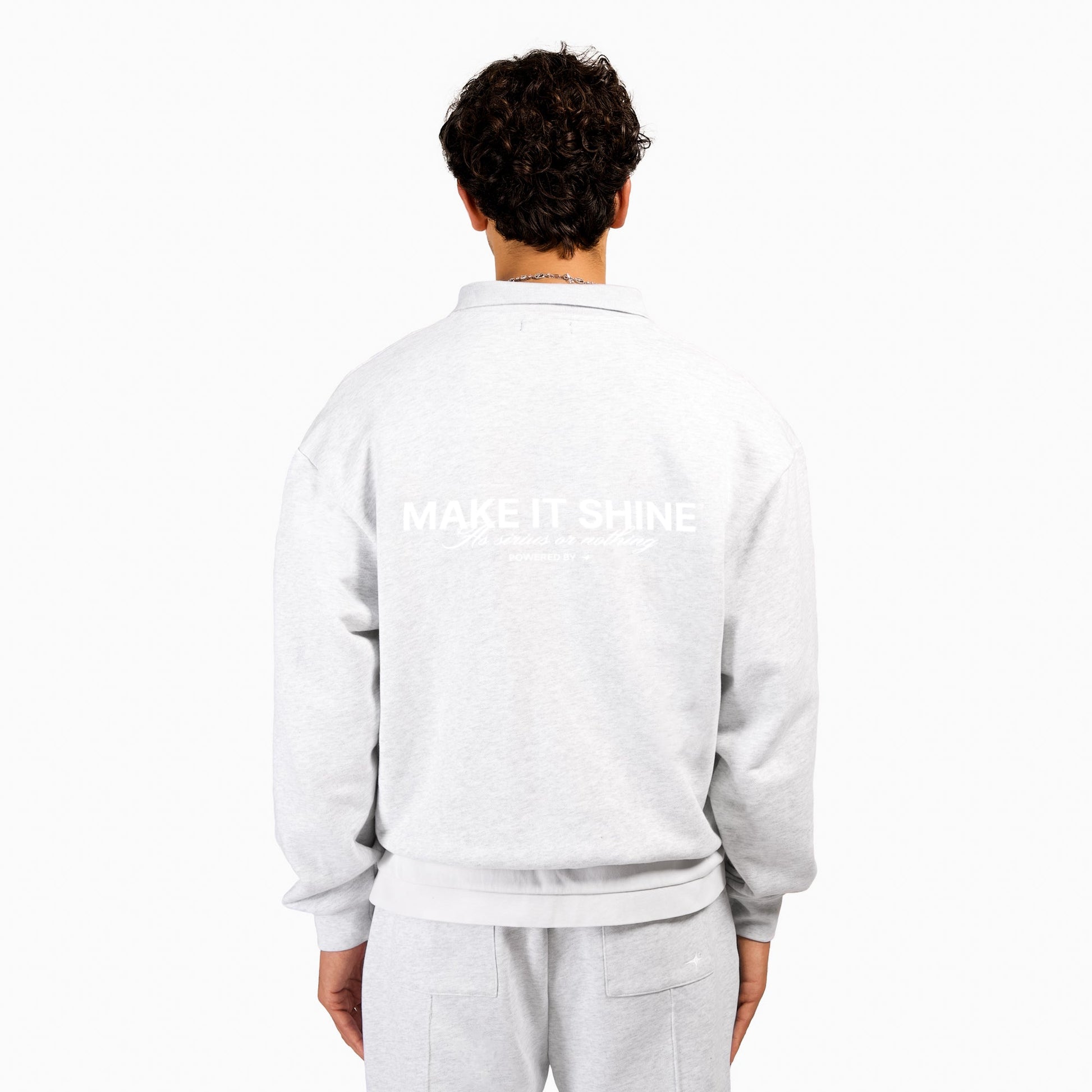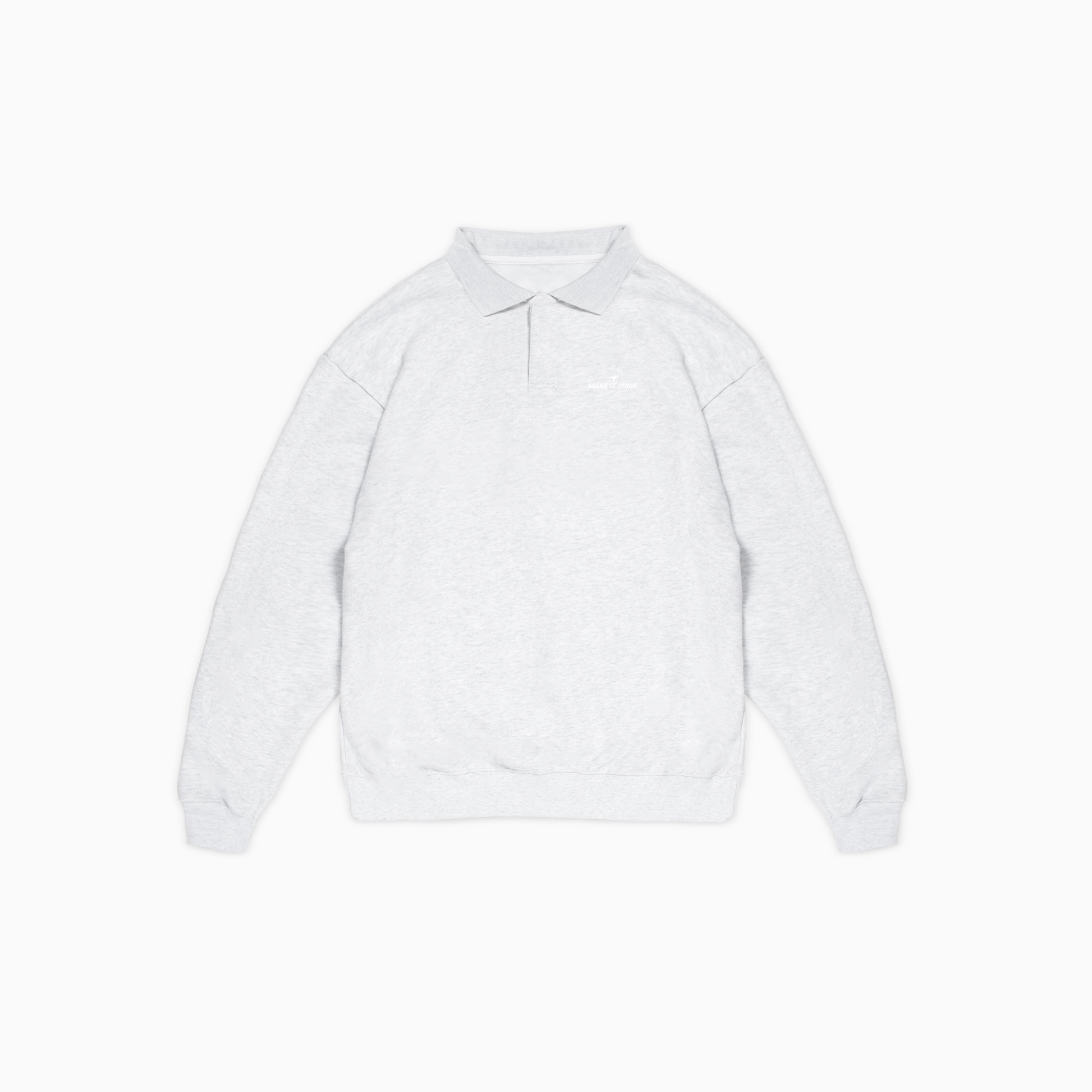 Grey long-sleeved jersey polo sweater with an oversized fit, made from high-quality, heavyweight cotton. Polo collar with snap buttons. Ribbed hem and cuffs.