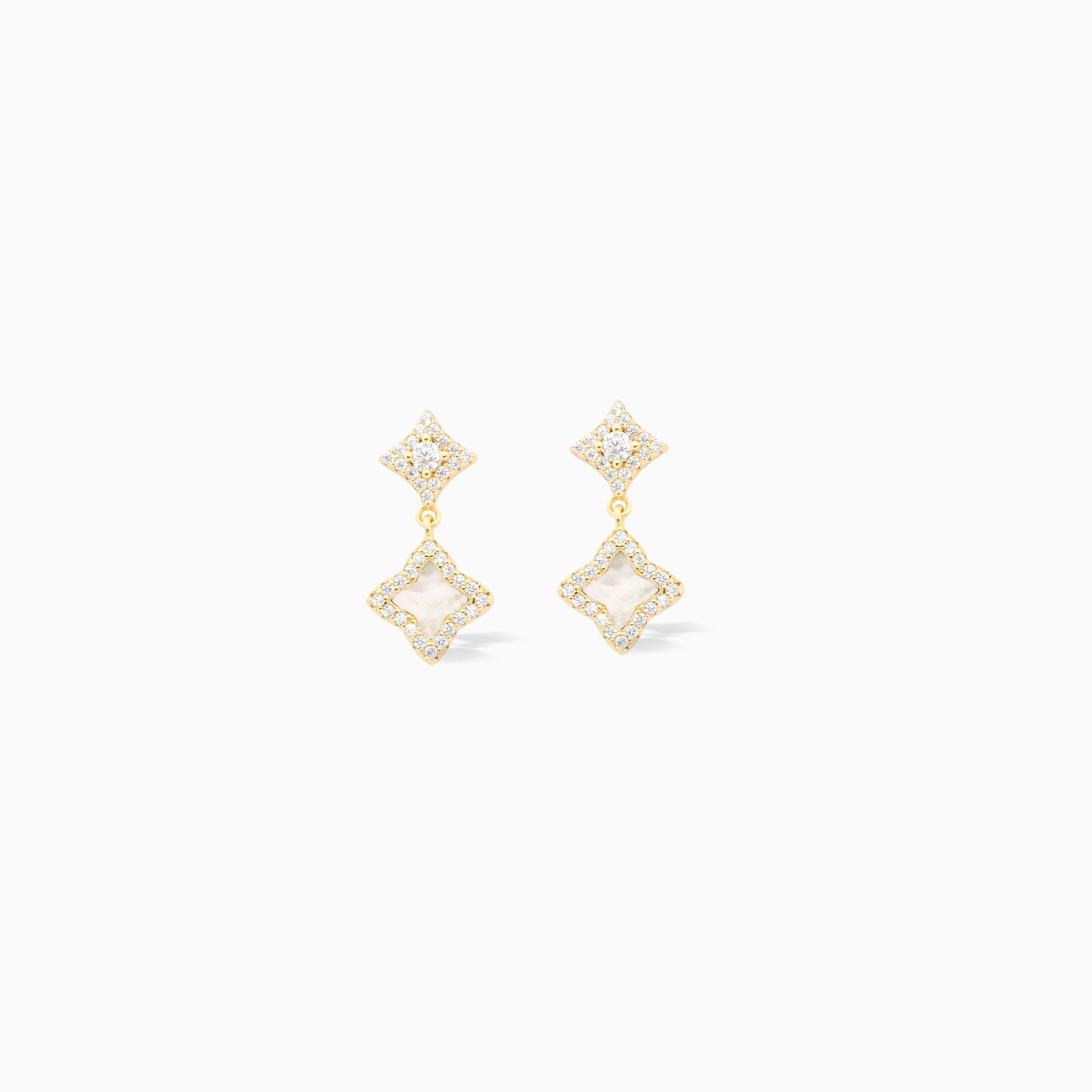 Discover the Stars & Flowers earrings , a perfect marriage of sparkle and delicacy. These 2cm drop earrings feature a star set with shimmering cubic zirconia, accompanied by a flower adorned with a mother-of-pearl imitation stone that cascades gracefully.