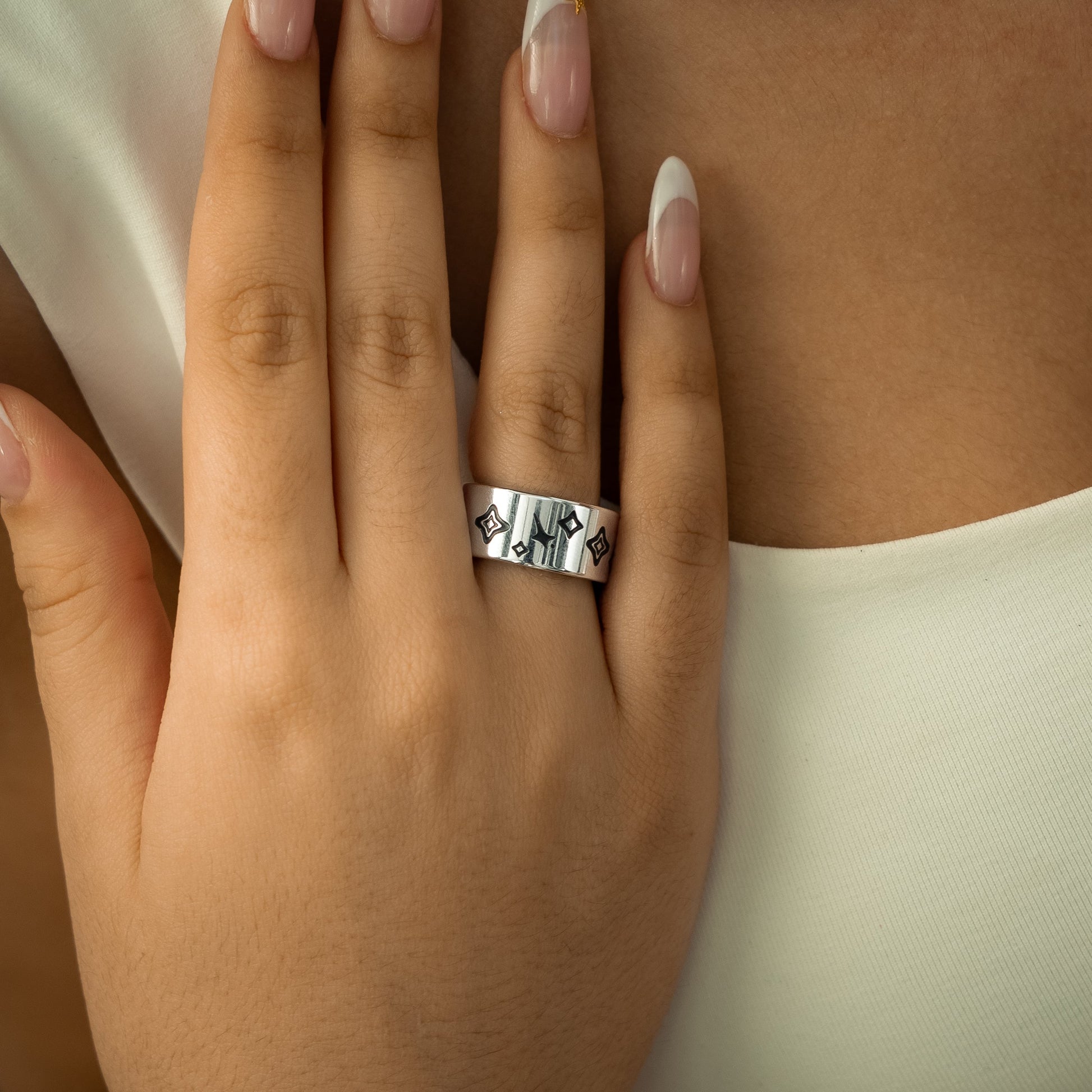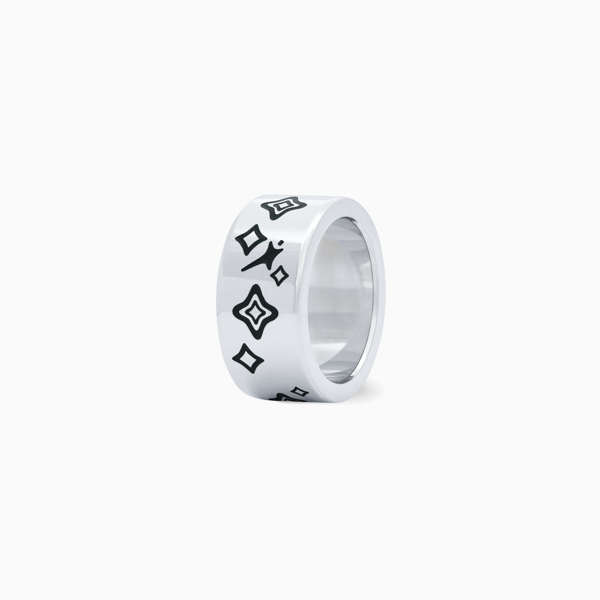 Découvrez la bague Stars & Flowers Band, une pièce distinctive de 10 mm de large. Ornée de motifs floraux et étoilés en émail noir, cette bague associe élégance et originalité.