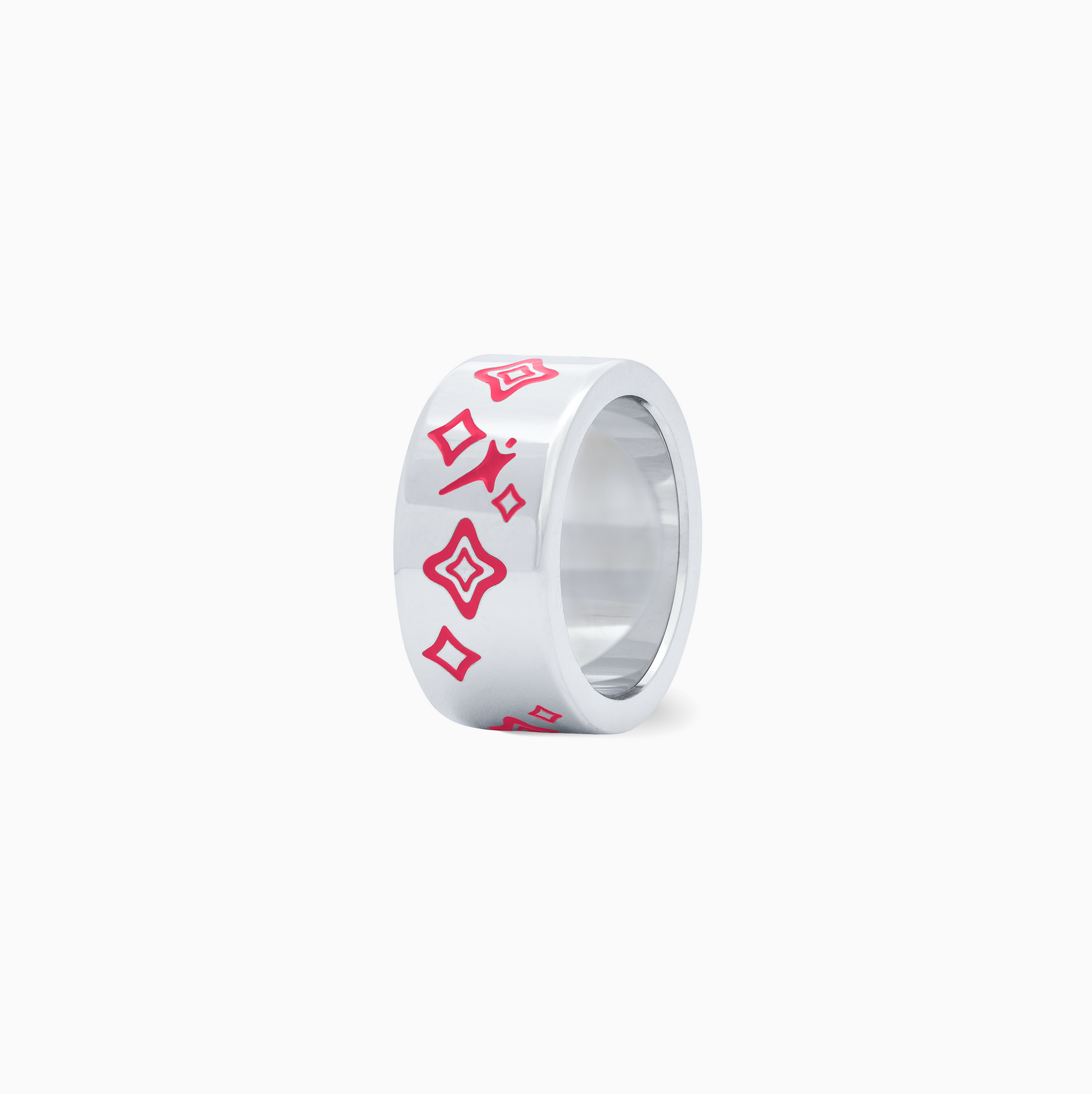 Découvrez la bague Stars & Flowers Band, une pièce distinctive de 10 mm de large. Ornée de motifs floraux et étoilés en émail rouge, cette bague associe élégance et originalité.