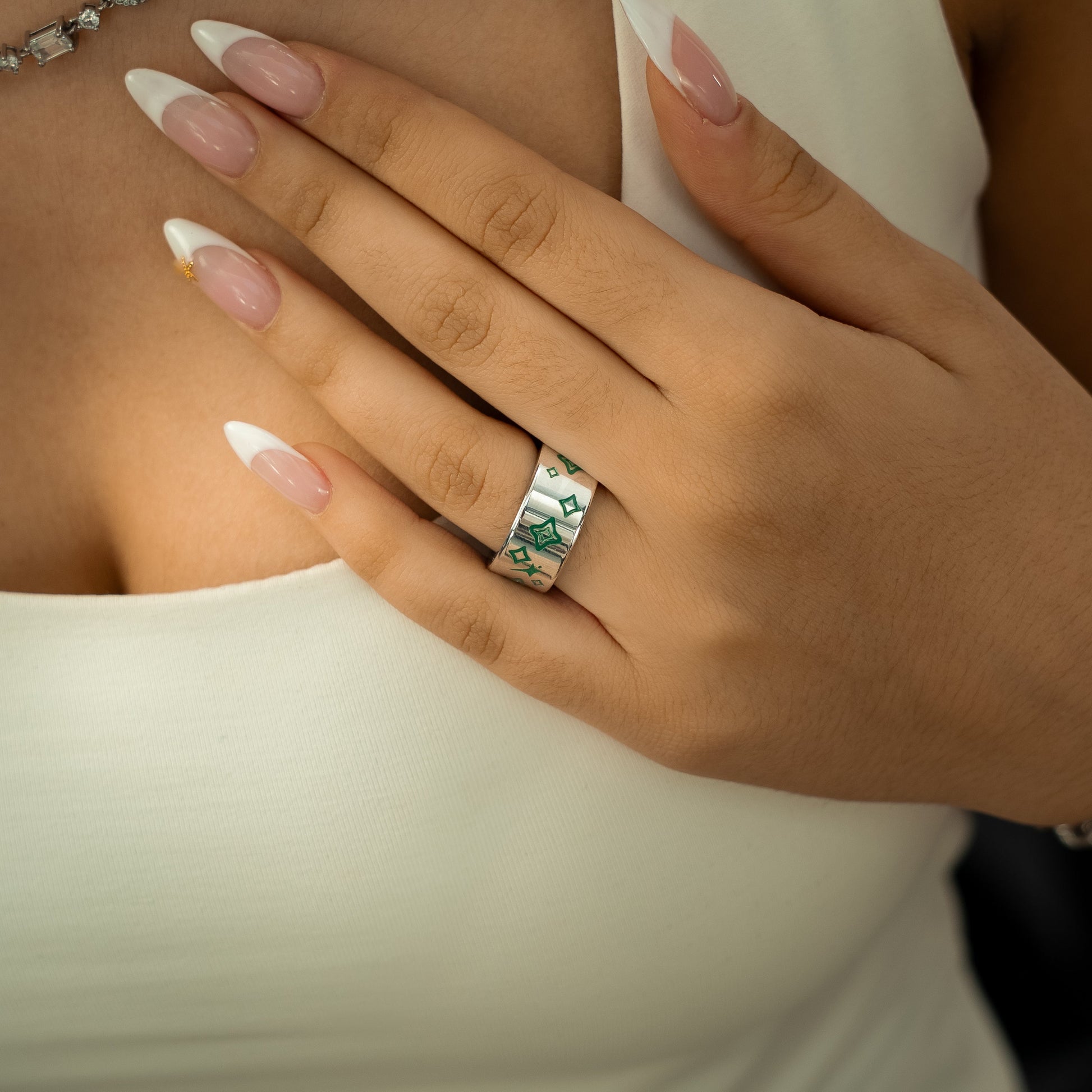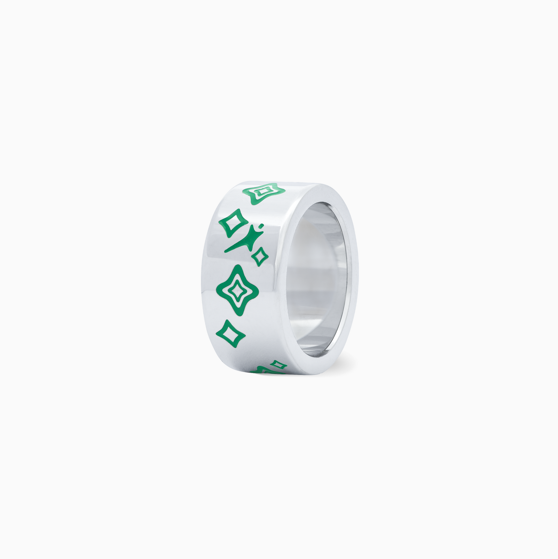 Découvrez la bague Stars & Flowers Band, une pièce distinctive de 10 mm de large. Ornée de motifs floraux et étoilés en émail vert, cette bague associe élégance et originalité.