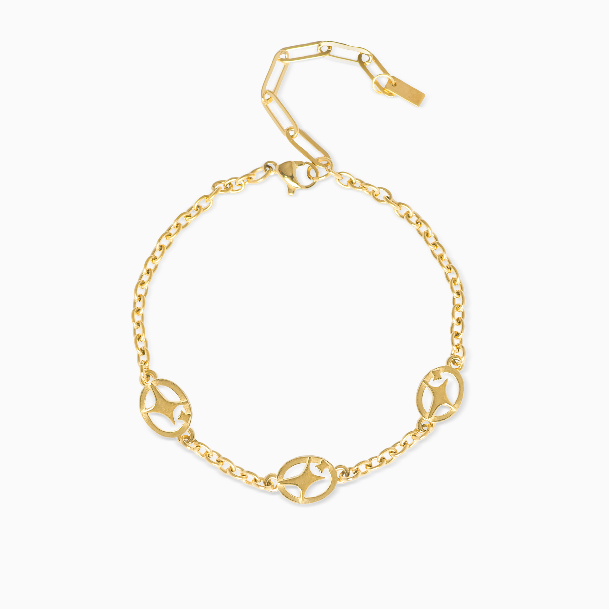 Découvrez notre Bracelet Signature, une pièce élégante qui associe modernité et sophistication. Orné de maillons raffinés, ce bracelet est agrémenté de trois motifs ovales ajourés, chacun gravé de l'étoile iconique de Make it Shine, symbole de style et de finesse. Sa chaîne câble se termine par un fermoir sécurisé et une rallonge, permettant un ajustement parfait à votre poignet.