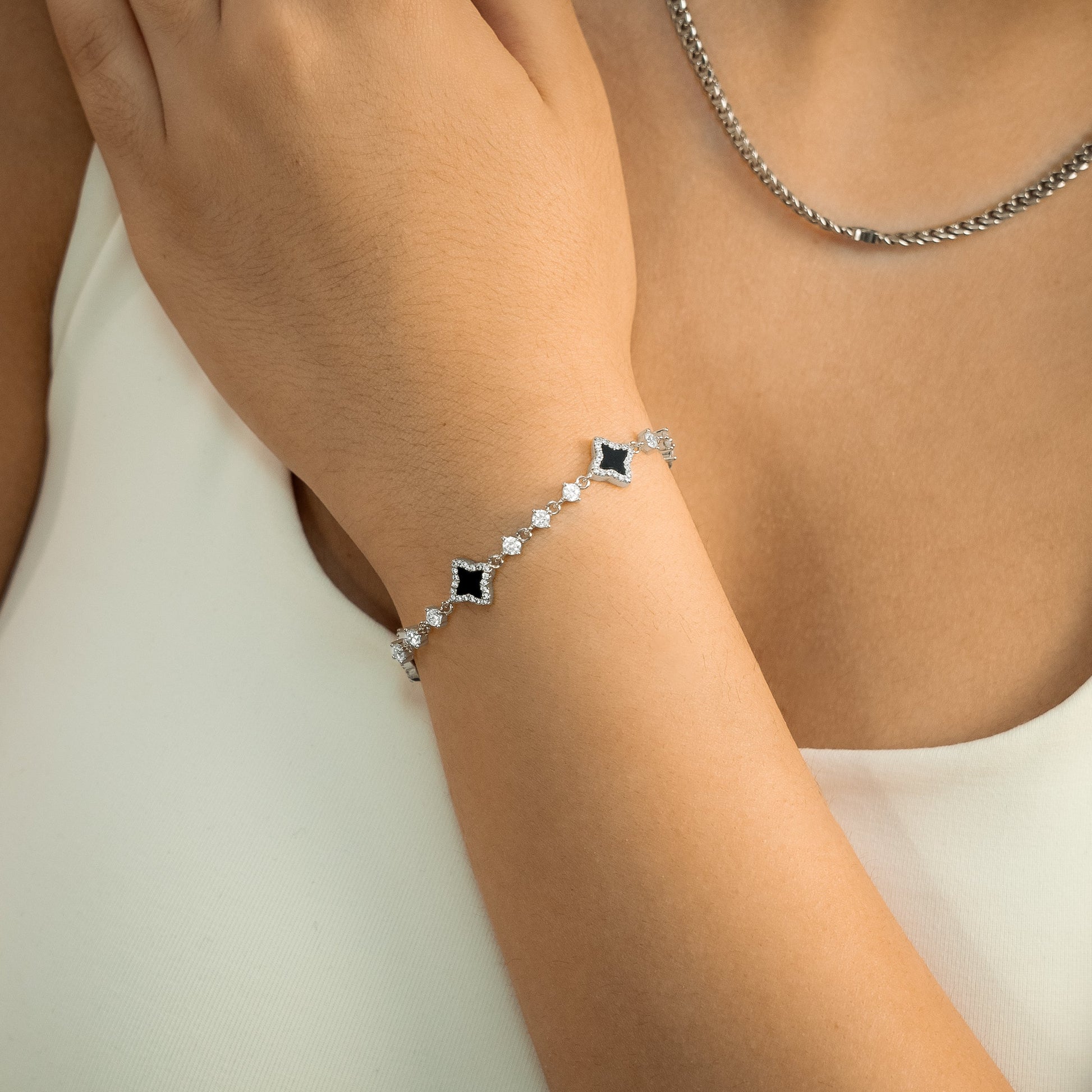 Découvrez notre Bracelet Flower Tennis, une pièce exquise qui marie l'élégance intemporelle du bracelet tennis et la délicatesse des fleurs. Chacune des fleurs, ornée d'une pierre imitation onyx et d'une épaisseur de 8 mm, ajoute une touche de charme et de sophistication à ce bracelet de 3 mm.