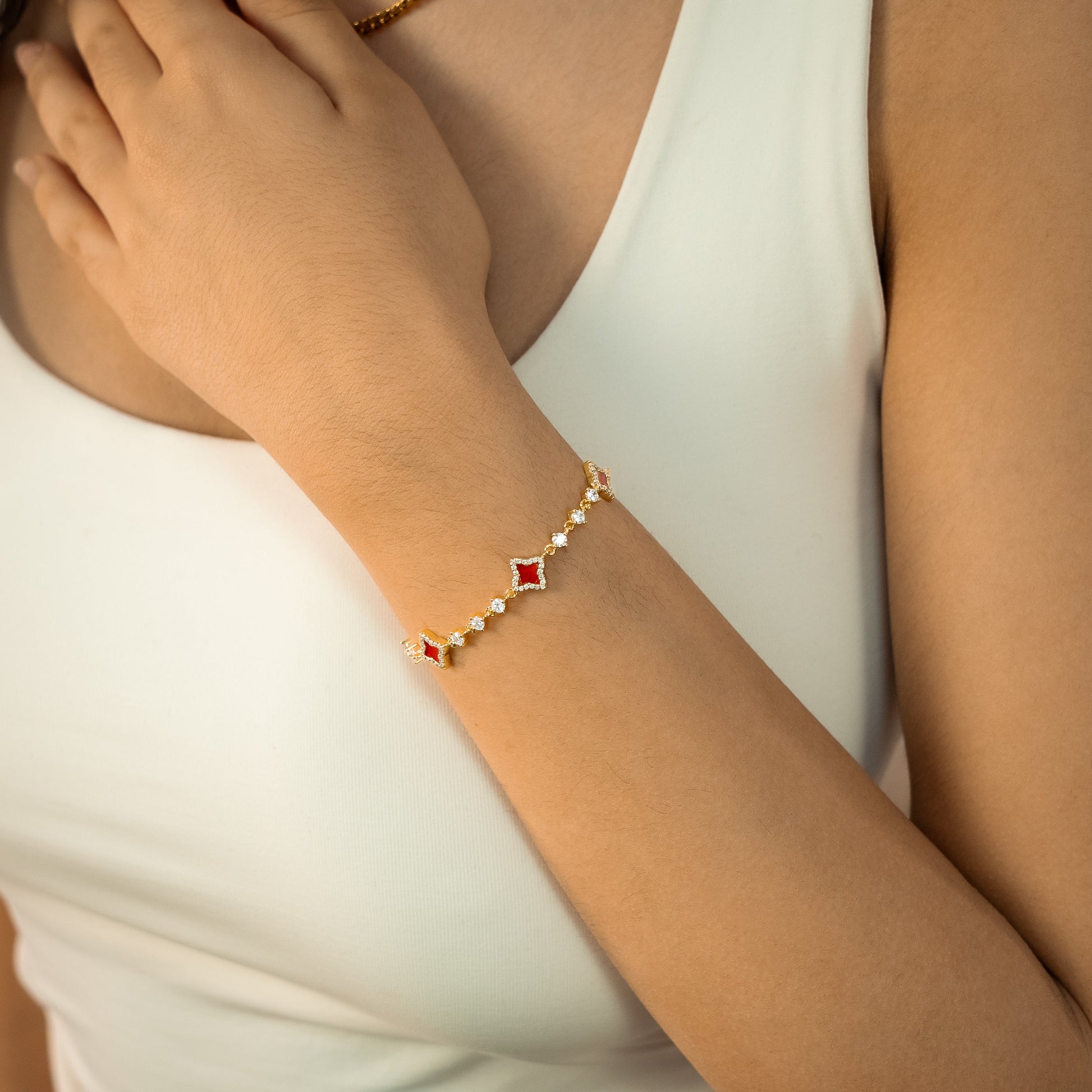Bracelet Flower Tennis Doré - Motif Rouge