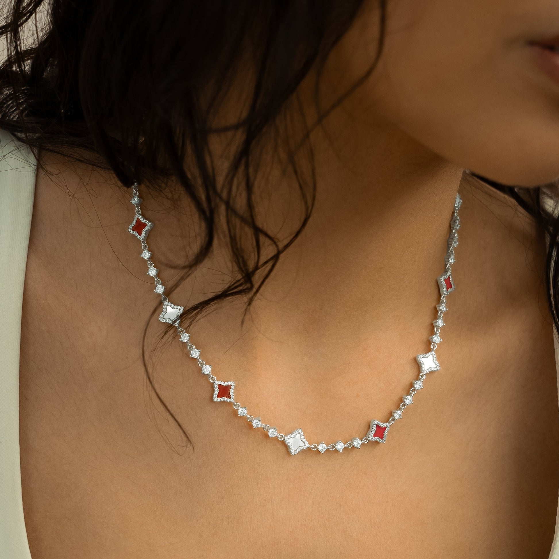 Chaîne Flower Tennis Argentée - Motif Blanc & Rouge