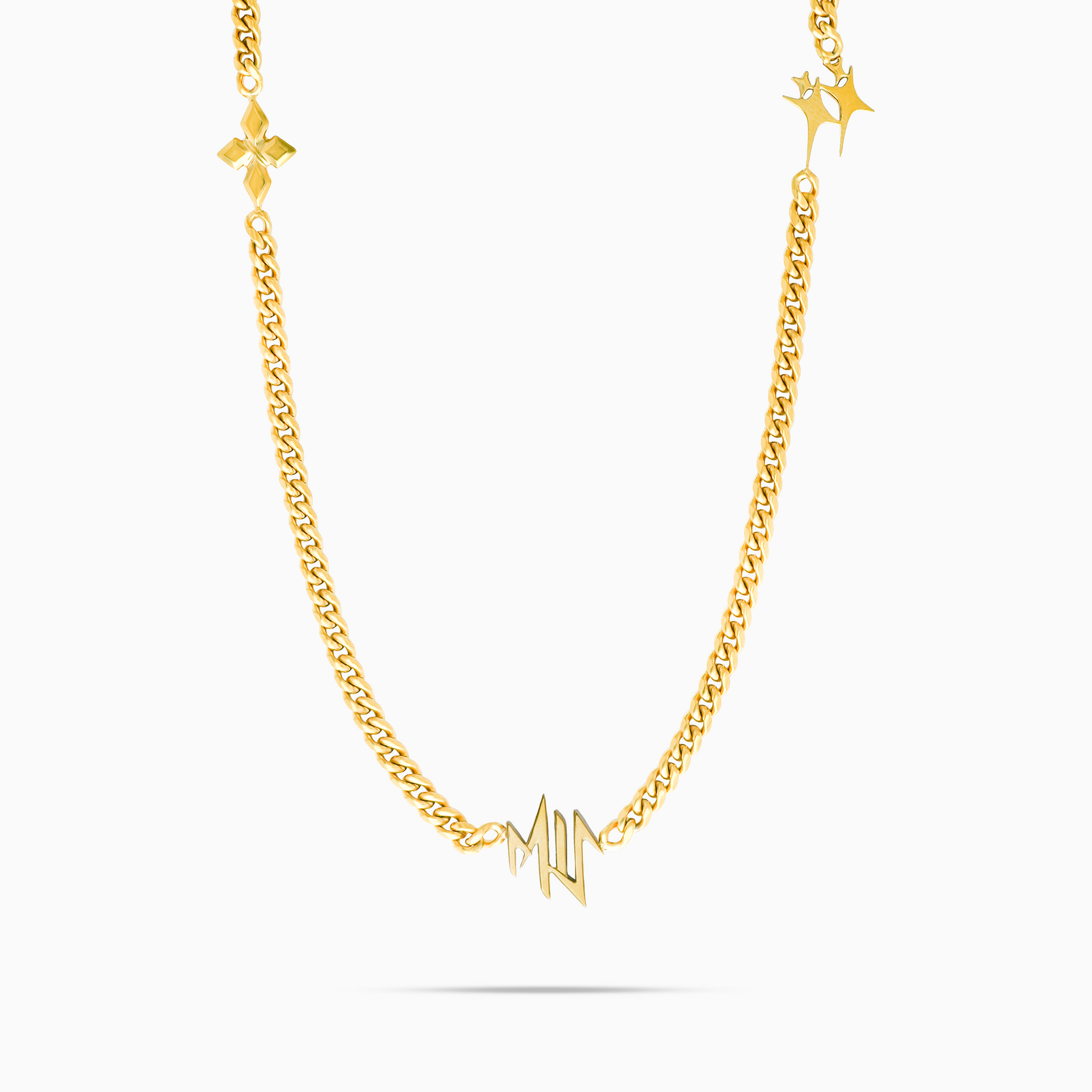 La chaîne MIS Cuban réunit les trois symboles emblématiques de Make It Shine : la croix étoilée, le logo double étoile et le sigle MIS.