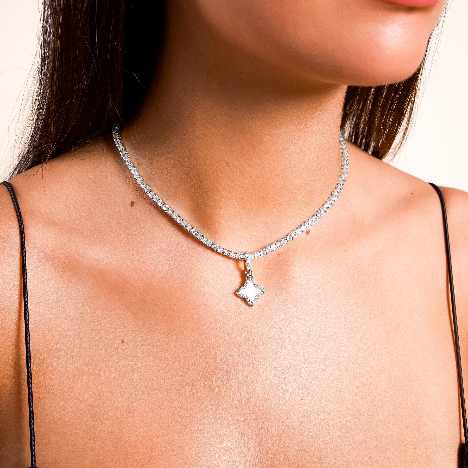 Voici notre pendentif Flower, alliant délicatesse et raffinement intemporel. Au cœur de ce bijou, une fleur sertie de pierres scintillantes met en valeur une pierre centrale en imitation nacre, le tout offrant une épaisseur de 8 mm pour un charme subtil et lumineux.