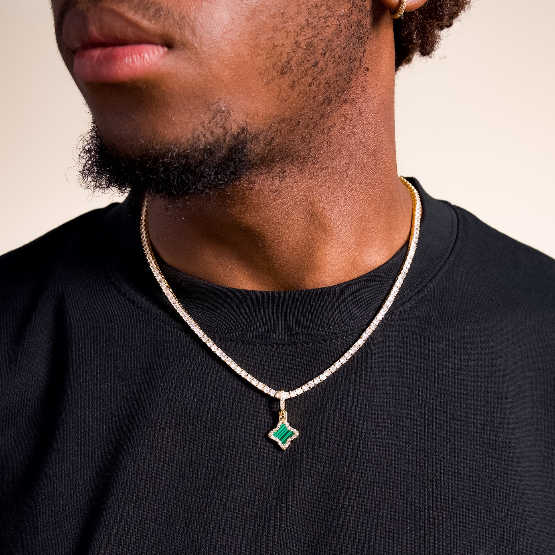 Voici notre pendentif Flower, alliant délicatesse et raffinement intemporel. Au cœur de ce bijou, une fleur sertie de pierres scintillantes met en valeur une pierre centrale en imitation malachite, le tout offrant une épaisseur de 8 mm pour un charme subtil et lumineux.