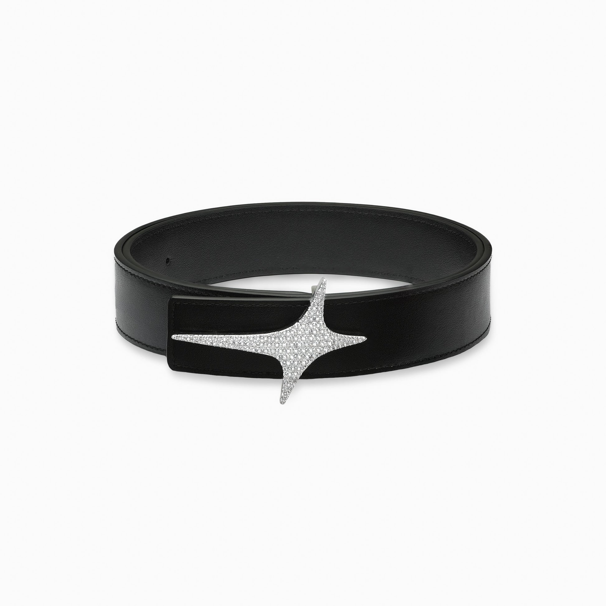 Ceinture en cuir véritable noir. Boucle avec logo Make it Shine en métal argenté, ornée d'oxydes de zirconium. Finition brillante et détails travaillés pour un style affirmé. Au dos, inscription débossée “As Sirius or Nothing” en ton sur ton.