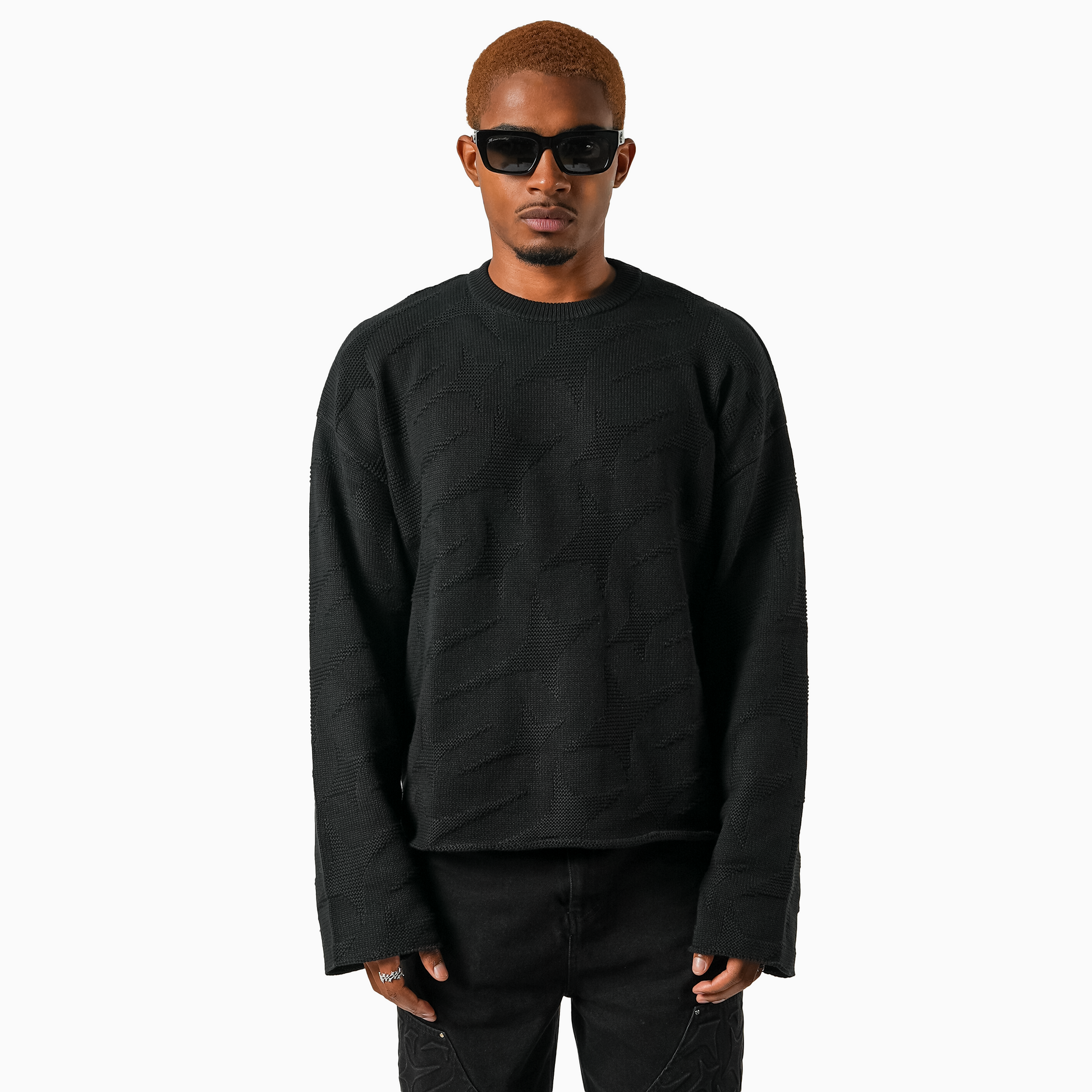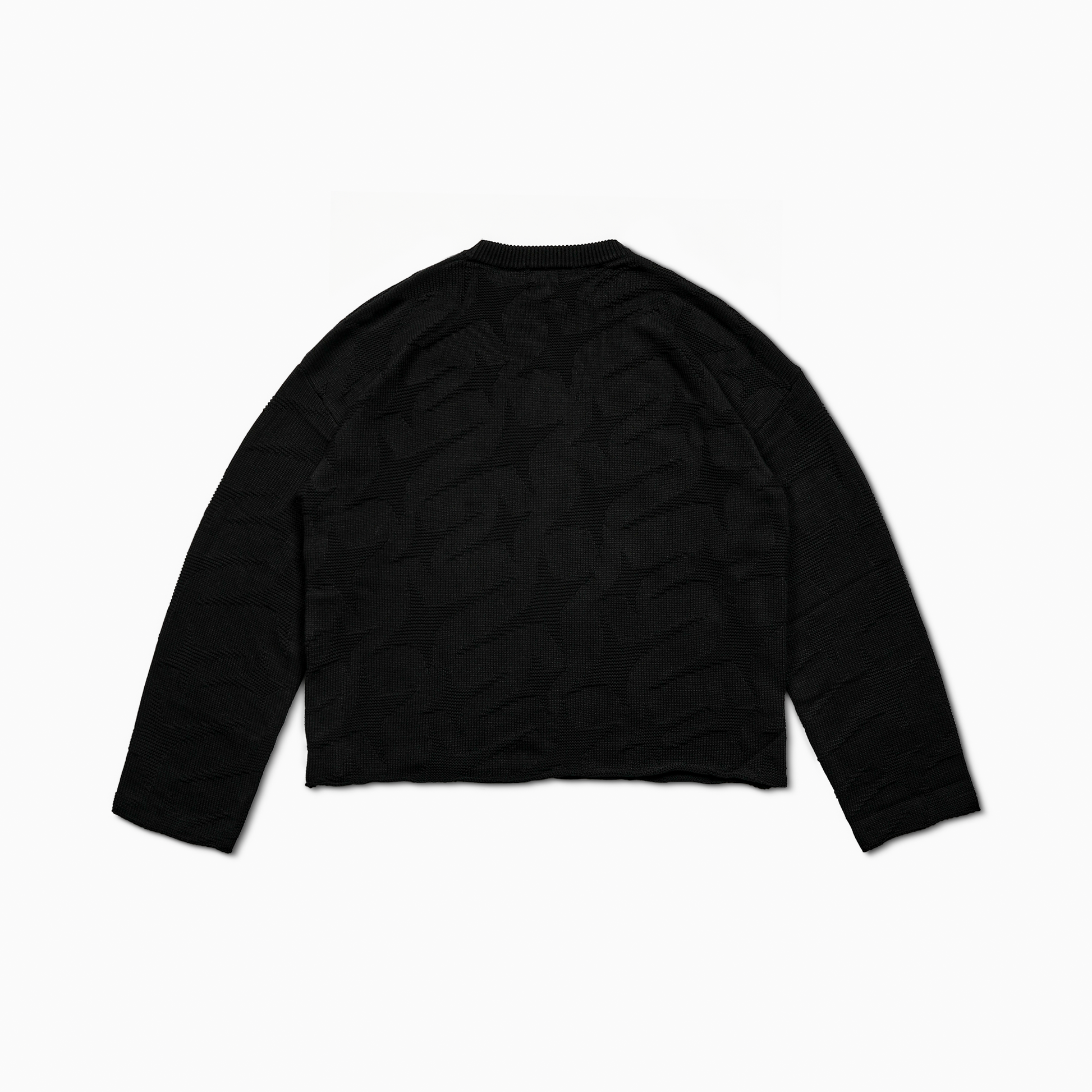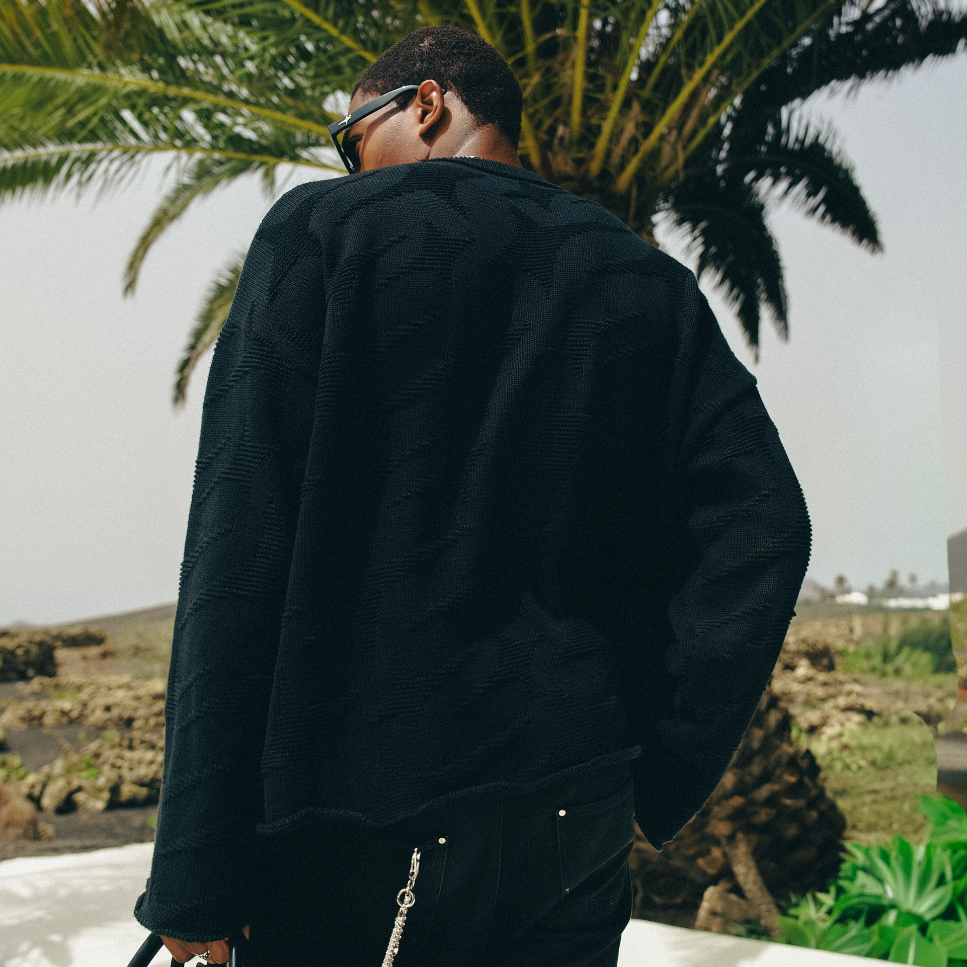 Pull noir en coton à manches longues avec une coupe oversize, fabriqué en 100% coton de qualité supérieure. Monogramme embossé en relief sur l’ensemble. Col ras de cou côtelé, manches sans élastiques aux poignets.