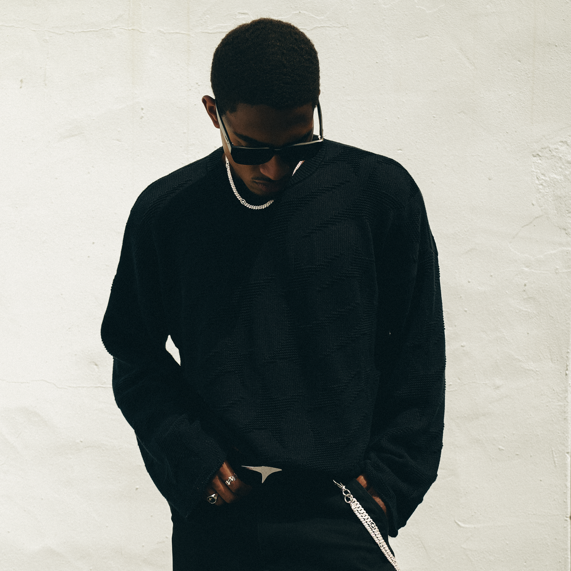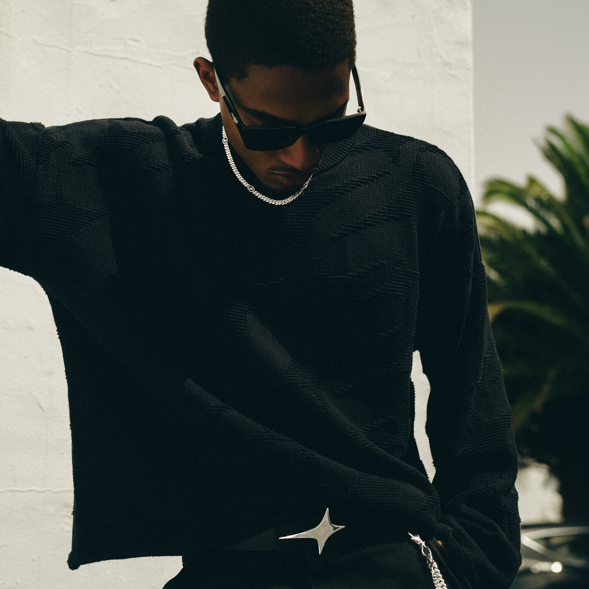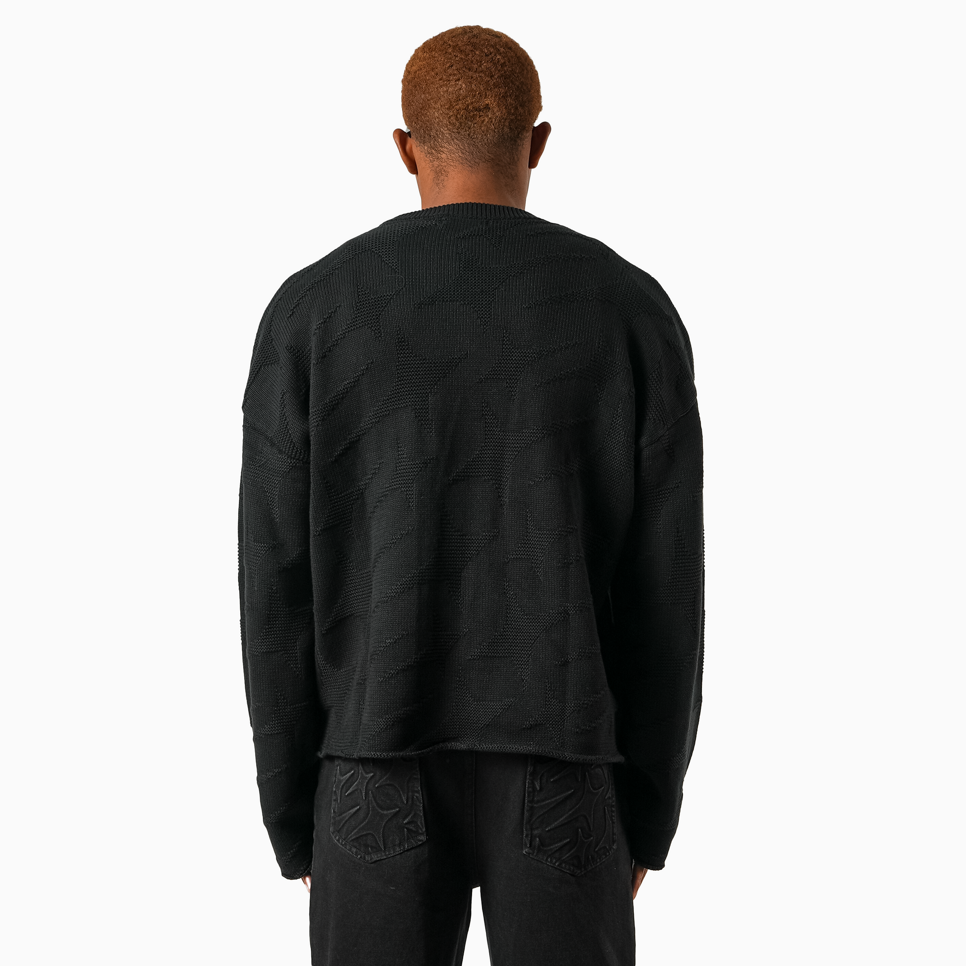 Pull noir en coton à manches longues avec une coupe oversize, fabriqué en 100% coton de qualité supérieure. Monogramme embossé en relief sur l’ensemble. Col ras de cou côtelé, manches sans élastiques aux poignets.