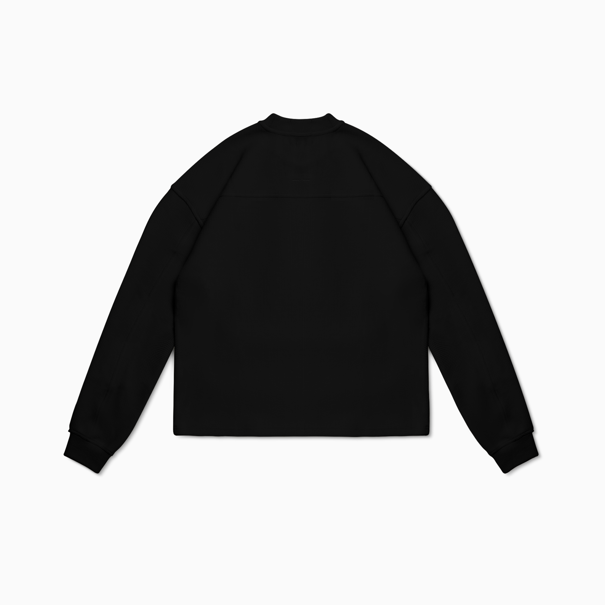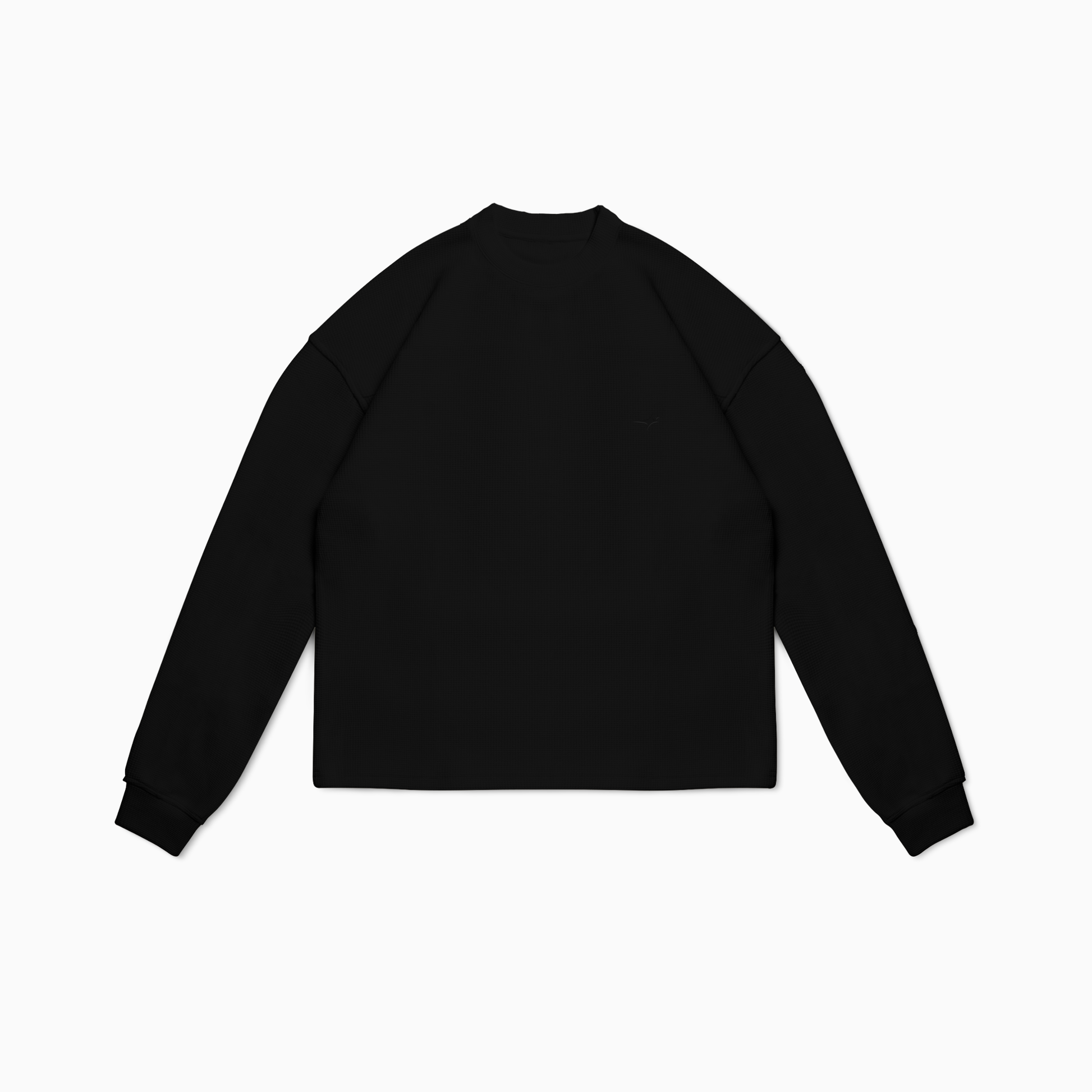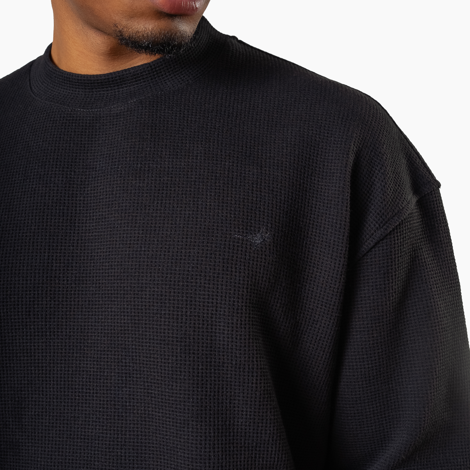 Waffle Sweater noir à manches longues avec une coupe oversize et boxy, fabriqué en coton épais de qualité supérieure. Resserré aux poignets. Col ras de cou.
