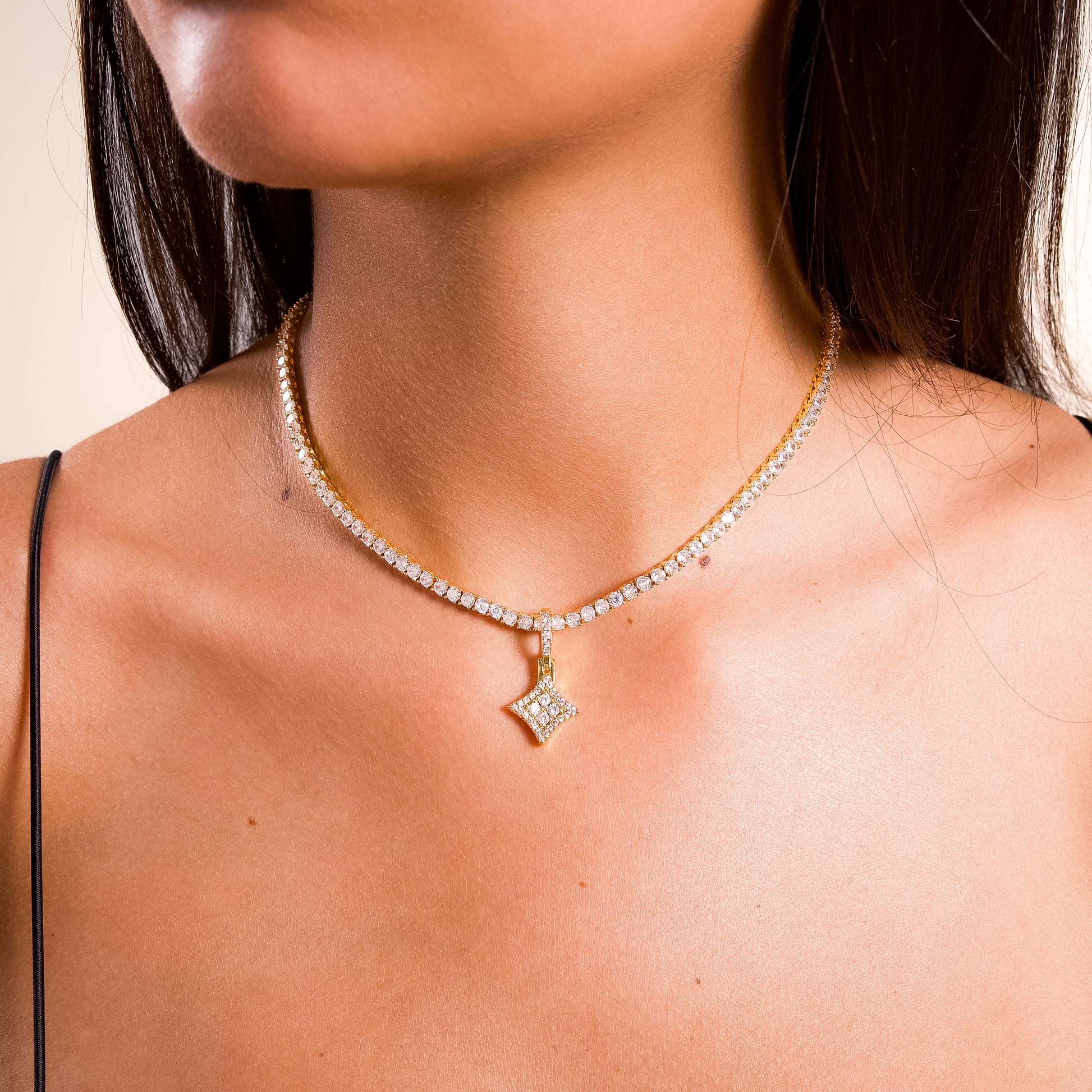 Voici notre pendentif Star, alliant élégance et éclat. Ce bijou se distingue par une étoile sertie de pierres scintillantes, offrant une épaisseur de 8 mm pour un charme subtil et lumineux.