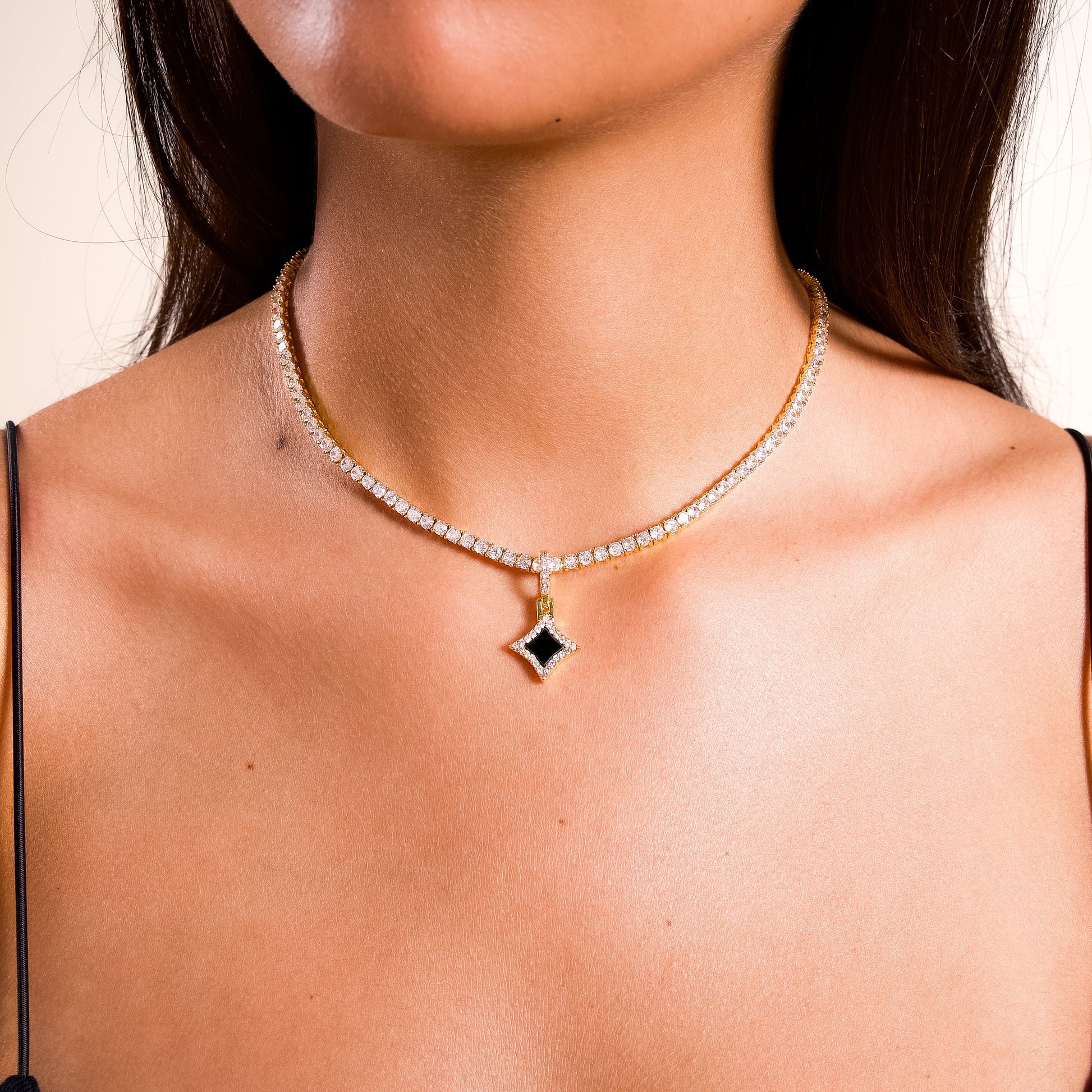 Voici notre pendentif Star, alliant élégance et éclat. Au cœur de ce bijou, une étoile sertie de pierres scintillantes met en valeur une pierre centrale en imitation onyx, le tout offrant une épaisseur de 8 mm pour un charme subtil et lumineux.