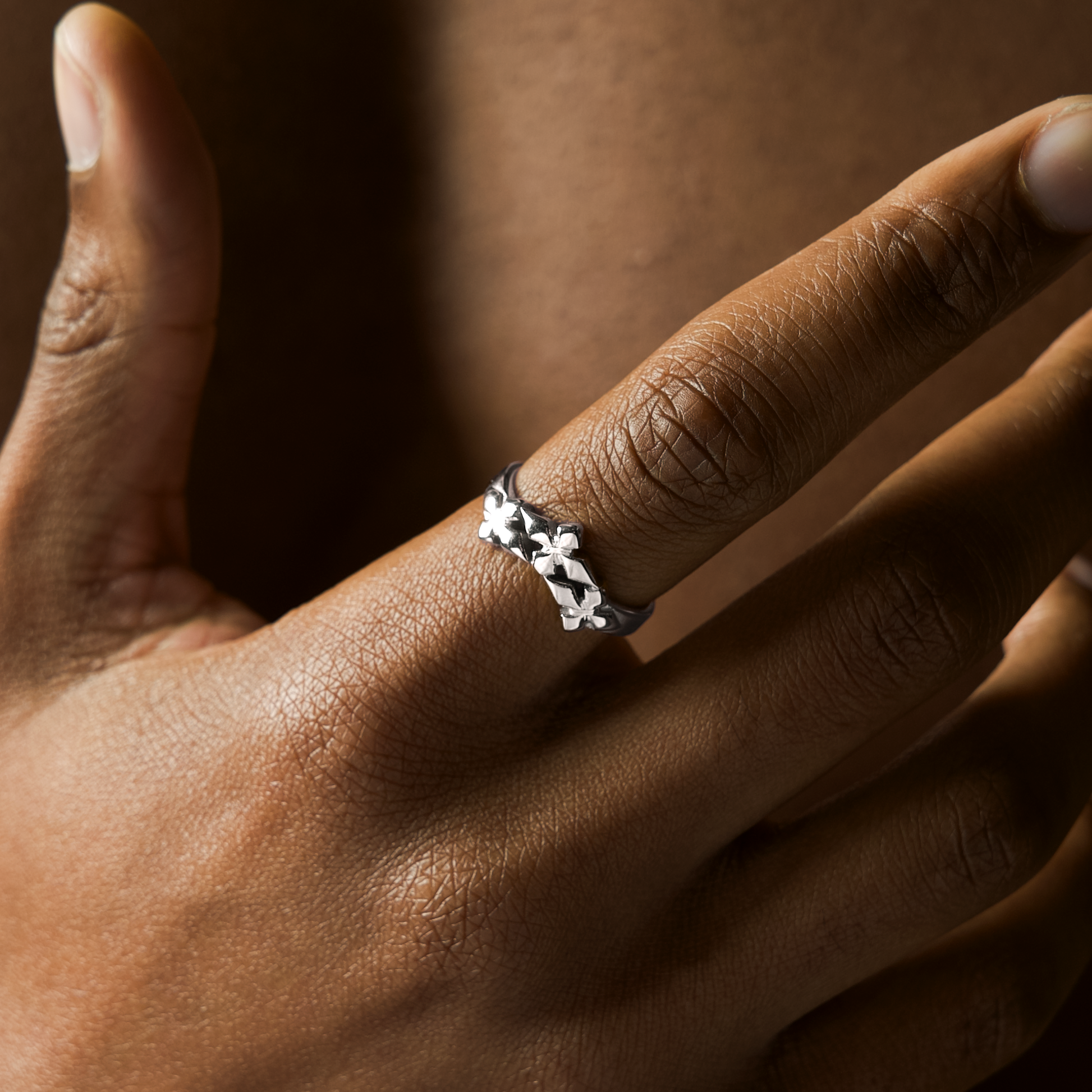 La Triple Crossed Star Ring incarne le symbole central de la collection Destiny : la croix étoilée.